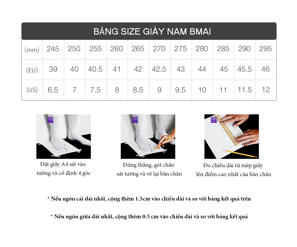 Một lưu ý quan trọng nữa : Đôi khi bạn nắm đc số đo và cách quy đổi tương ứng với các nhãn hàng, nhưng bạn sẽ khó nắm bắt được form dáng của từng dòng giày. Vì vậy, khi đã có đủ thông tin, hãy chụp lại và gửi cho chúng tôi, chúng tôi sẽ hỗ trợ bạn đưa ra quyết định đúng đắn nhất để tránh mất thời gian. Ngoài ra bạn hoàn toàn có thể yên tâm : mua hàng từ Bmai.com.vn, bạn sẽ được hỗ trợ đổi size, đổi kiểu miễn phí cho đến khi ưng chân ưng ý