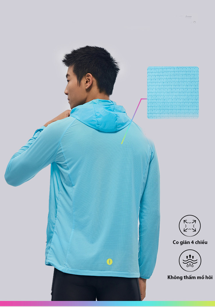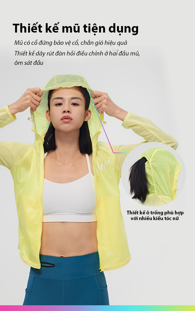 Mũ Trùm Đầu Điều Chỉnh Ôm Khít: Mũ trùm đầu của áo gió BMAI được thiết kế với cổ đứng bảo vệ cổ và dây rút đàn hồi điều chỉnh ở hai đầu, giúp mũ ôm khít với mọi kiểu đầu, đảm bảo không bị xê dịch khi chạy.