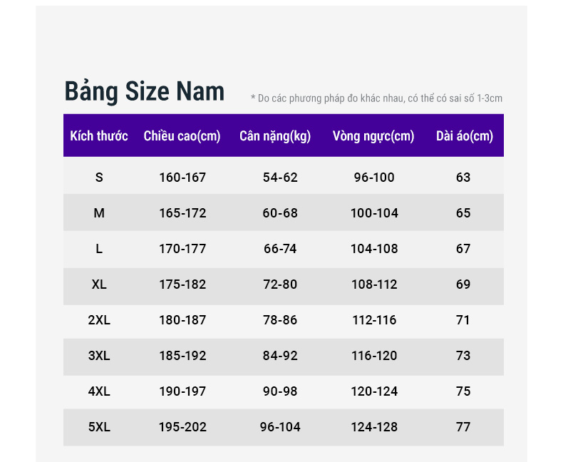 S, M, L, XL, XXL, 3XL, 4XL, 5XL