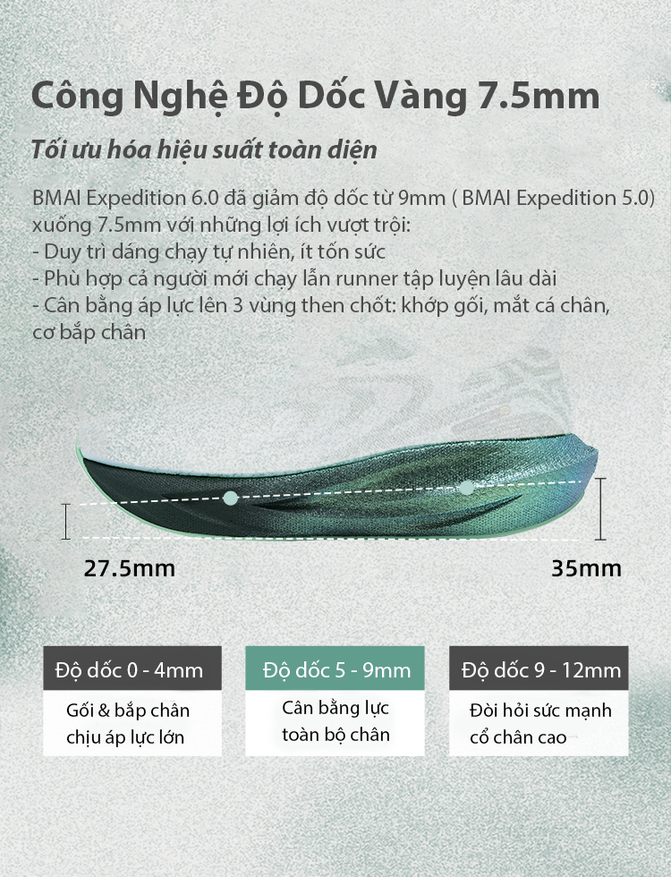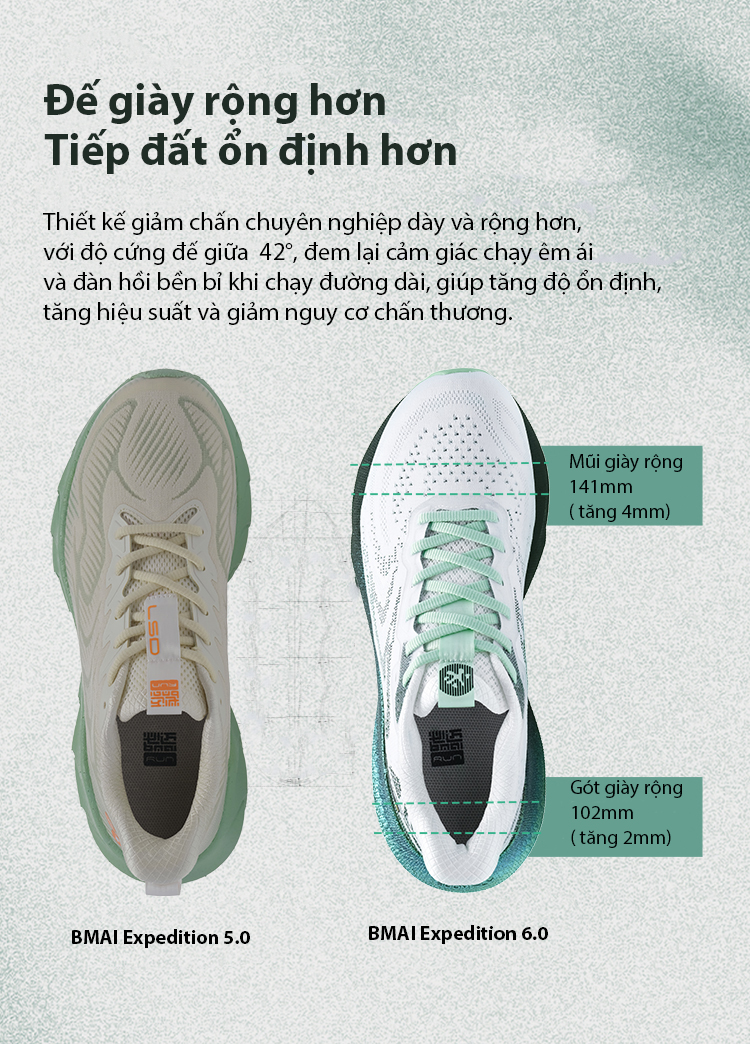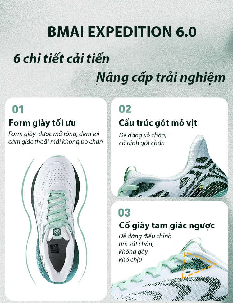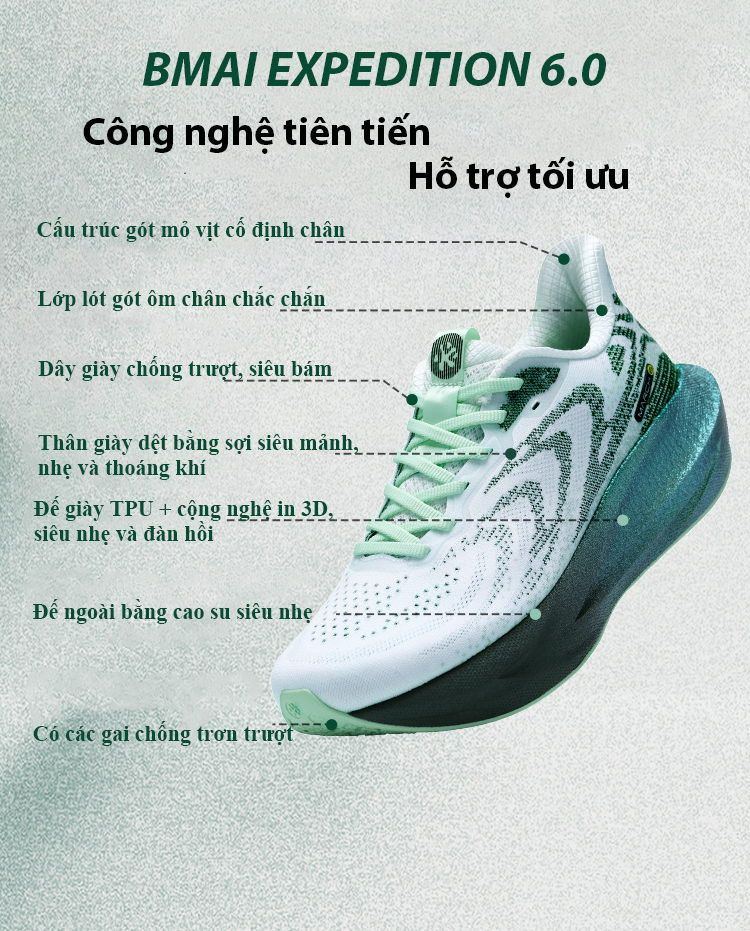 BMAI Expedition 6.0 là mẫu giày chạy bộ mới nhất được nghiên cứu và phát triển dành cho mọi đối tượng, từ người mới bắt đầu đến vận động viên chuyên nghiệp. Với hàng loạt cải tiến về công nghệ, giày mang đến trải nghiệm êm ái, bền bỉ và hỗ trợ tối ưu cho đôi chân.