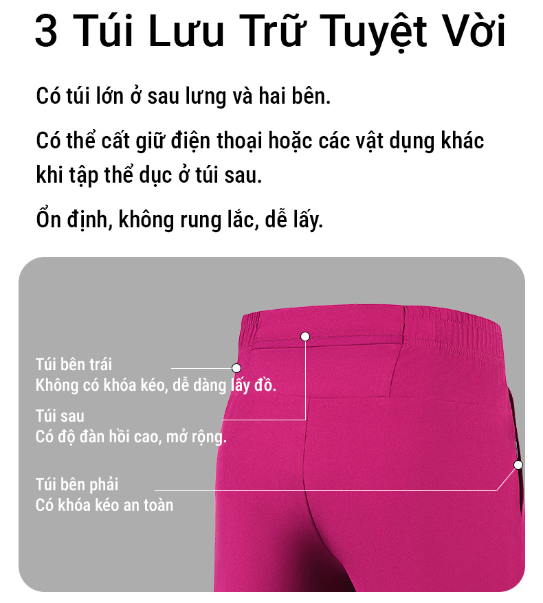 Với thiết kế 3 túi rộng rãi, trong đó có túi lớn ở phía sau và hai túi bên hông, bạn có đủ không gian để mang theo điện thoại, chìa khóa và các vật dụng cá nhân khác mà không cần phải lo lắng.