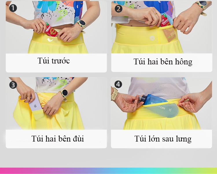 - Tiện ích tối đa: Tích hợp nhiều túi ẩn xung quanh (phía trước, hai bên hông, hai bên đùi và túi lớn phía sau) giúp bạn dễ dàng mang theo điện thoại, gel, nước hay các vật dụng cá nhân một cách gọn gàng và an toàn.